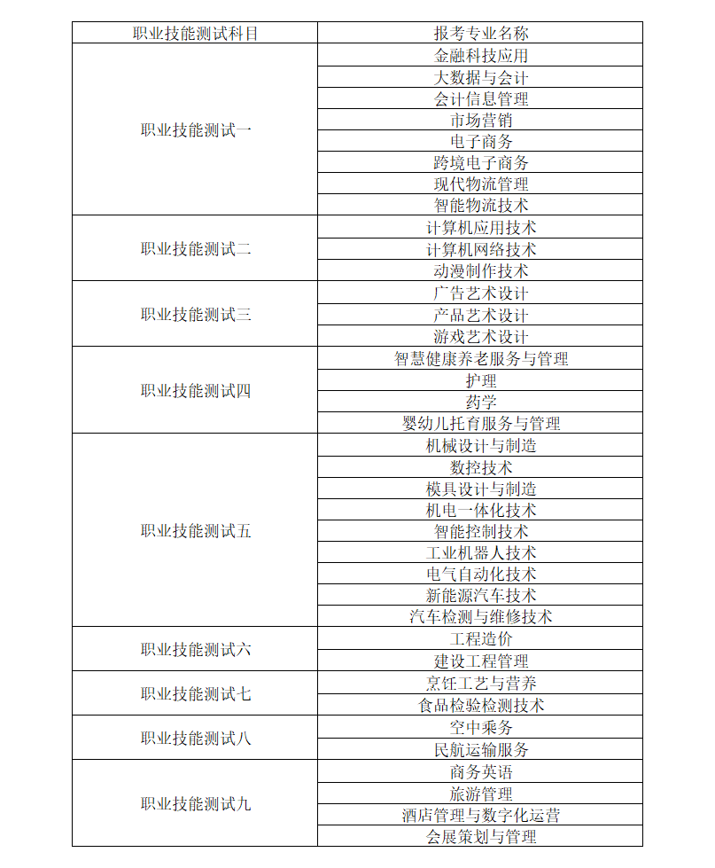 考生按照報考第一專業志愿參加相應科目進行測試,詳見下表。