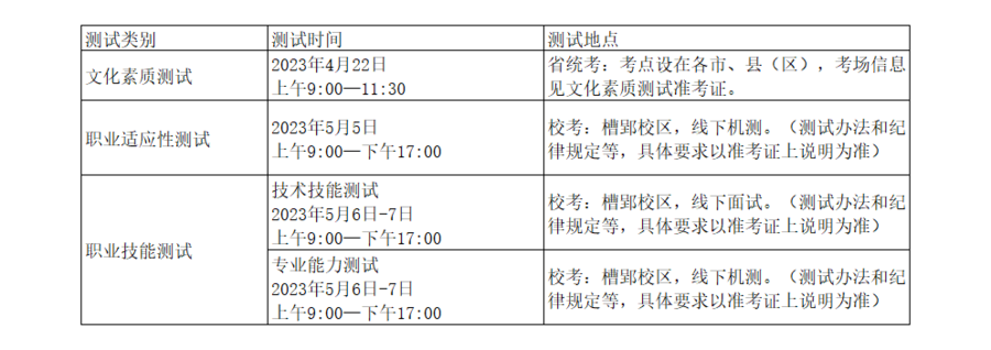 分類考試招生實行“文化素質+職業技能”的考試評價方式。文化素質測試由省教育招生考試院統一組織。文化素質測試合格者,普通高中畢業生、具有高中階段學歷或同等學力及以上的社會人員參加學院組織的職業適應性測試,中職學校、中等技工學校等中等職業學校畢業生參加我院組織的職業技能測試,退役軍人根據其中等教育階段畢業類型(即參加高考報名時的“畢業類別”),參加職業適應性測試或職業技能測試(以下統稱校考)。